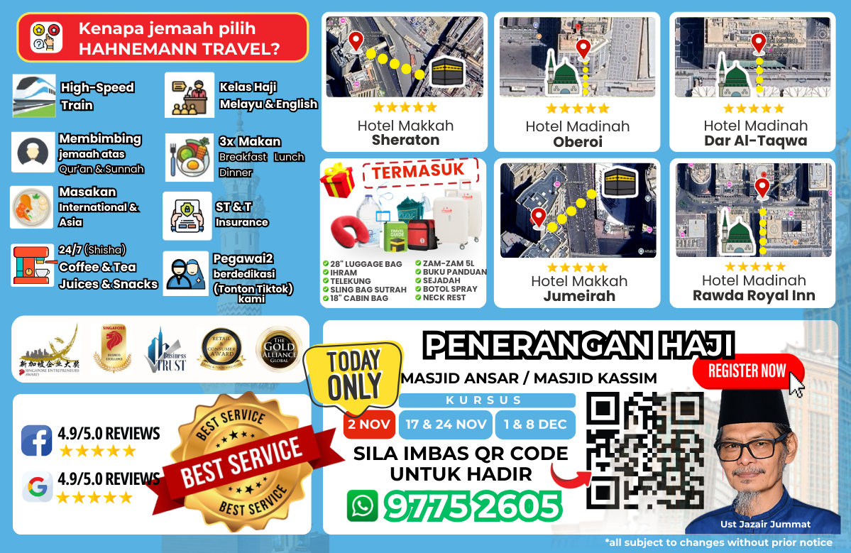 Depart for the Holy Pilgrimage Hajj 2026 (1447H) + stay in 5* Hotels that are directly in front of Masjidil-Haram (Kaaba) & Masjidil Nabawi with our big group Insya’Allah